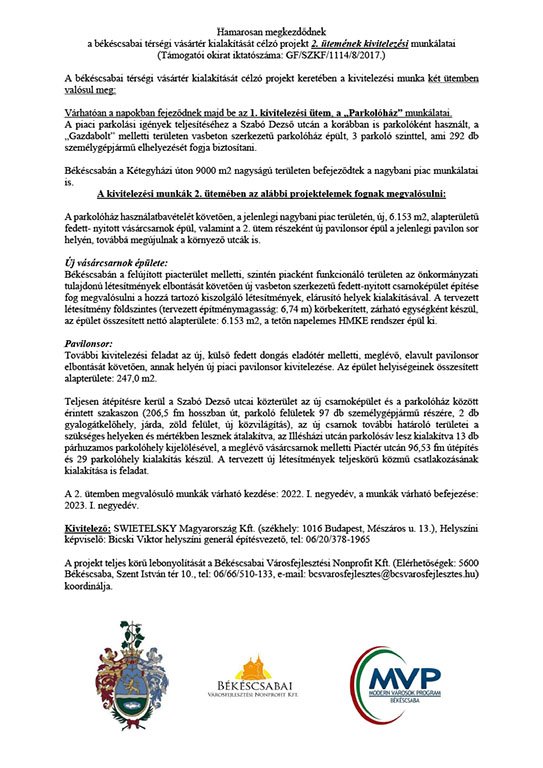Hamarosan megkezdődnek a békéscsabai térségi vásártér kialakítását célzó projekt 2. ütemének kivitelezési munkálatai